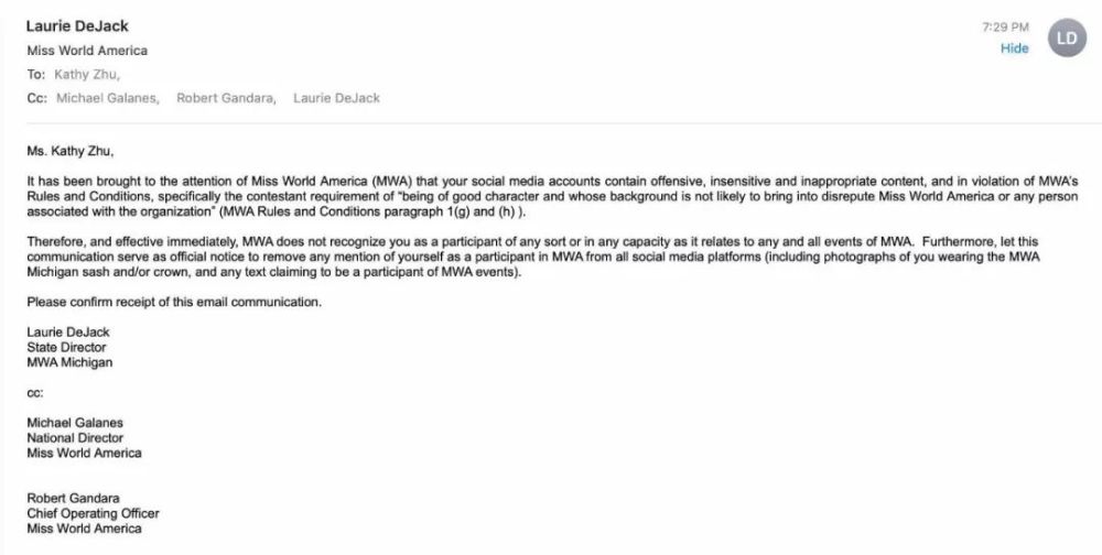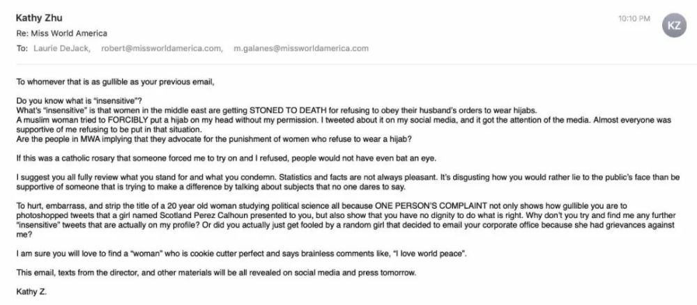 在被取消选美头衔后,朱凯蒂给竞赛官员写了一封邮件,据说措辞激烈,当然我觉得也没啥激烈的,只是真话而已,看来美帝也到了真话就是“偏激”,假话大行其道的时候了。邮件是这样写的:A92免费翻墙网