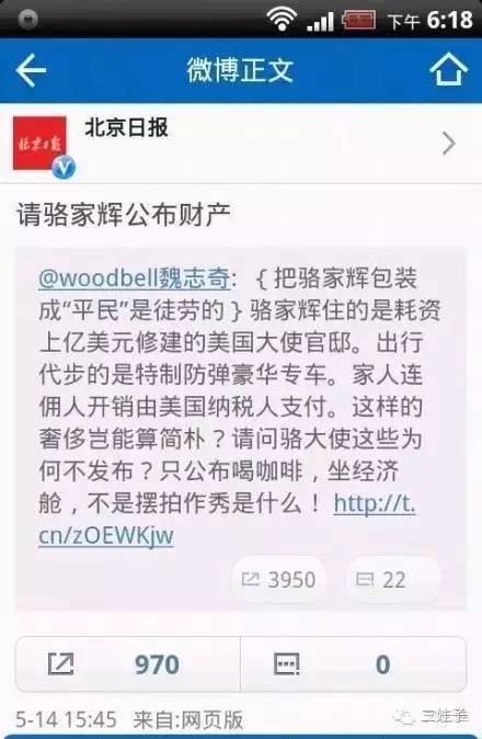 《北京日报》的新浪官博很快跟帖:请骆家辉公布财产。美国大使馆未在第一时间回应《北京日报》的呼吁。不过,很多热心网友很快从各种渠道收集到了骆家辉任公职以来公布个人财产的诸多官方文件。 3zq免费翻墙网
