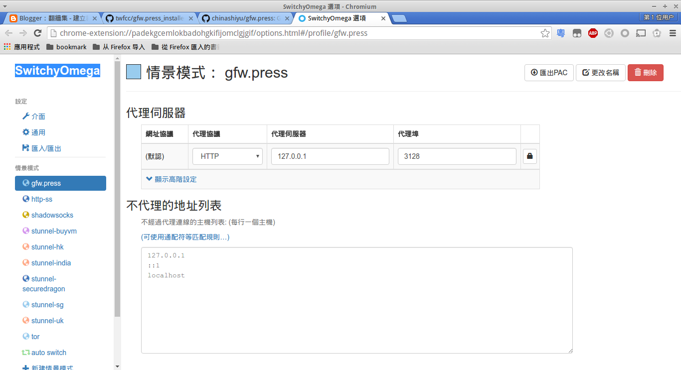 地址填入127.0.0.1,端口3128,儲存並轉到代理形式,正常可以使用了。