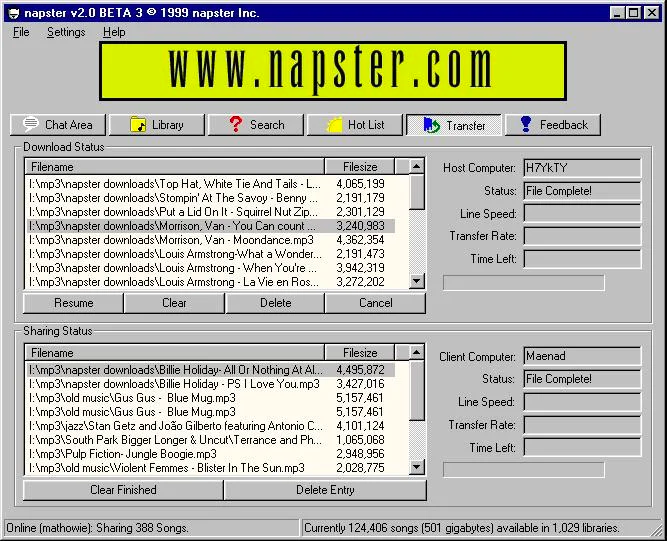 用户可以免费下载Napster客户端,然后从别人那里下载MP3文件,同时自己也作为一台服务器,供别人下载。