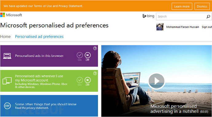 任务3:这是一个重要选项,你必须关掉。许多用户基本上都错过了这一个选项,因为这些设置只能通过外部网站才能修改。所以我们需要访问这个网址,在这里你将发现两个选项,即“浏览器中定制化的广告”和“当我使用微软账户时的个性化广告”,我们需要将这两个选项都关闭。8RT免费翻墙网