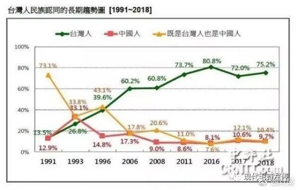 大 体说来,从1991年到2018年,27年间,认为自己不是中国人的台湾人,从13%,增加到75%。同期,认为自己也是中国人的台湾人,从73%,下降 到10.4%。同期,认为自己就是中国人的台湾人,大体保持在10%。2014年11月台湾九合一选举后,大陆几个重要媒体,纷纷转发一篇著名文章,《张 安乐:台湾已经没有中国人了》(见互联网),就是对台湾现状的精确描述。近日民调,台湾现在要统一的人不到1%,只有0.7%,多数是一些白发苍苍的老 头、老太太。十年后,这些人,或者死光了,或者走不动了。台湾现在45岁以下天然独,十年之后55岁以下天然独,二十年之后65岁以下天然独。蔡英文创纪 录高票连任的主要票源,就是这些中青年天然独。有学者说“外因对蔡连任发挥关键影响”,这是胡说八道。ZFX免费翻墙网