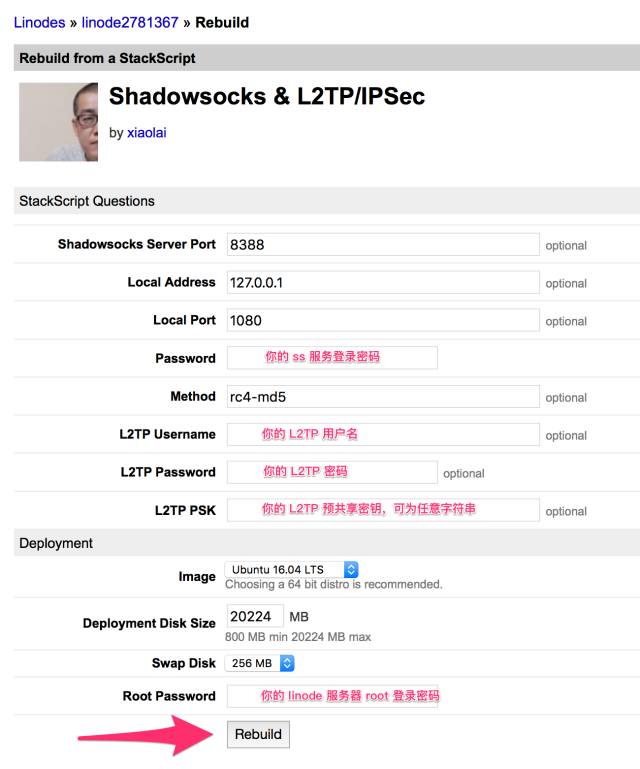 然后就是填写若干个字符串(都是各种密码),其实可以随便使用简单密码,反正你也不公开这个服务器地址…… 填好之后,按“Rebuild” 按钮。