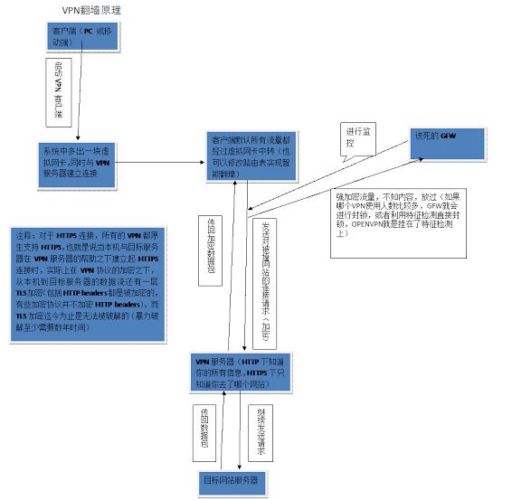 先 介绍一下VPN:VPN是Virtual Private Network(虚拟专用网)的缩写,本来是用于企业的一种网络服务,原理是客户端使用相应的VPN协议先与VPN服务器进行通信,成功连接后就在操作系 统内建立一个虚拟网卡,一般来说默认PC上所有网络通信都从这虚拟网卡上进出,经过VPN服务器中转之后再到达目的地。通常VPN协议都会对数据流进行强 加密处理,从而使得第三方(例如GFW)无法知道数据内容,这样就实现了翻墙。翻墙时VPN服务器知道你干的所有事情(HTTP,对于HTTPS,它知道 你去了哪)。