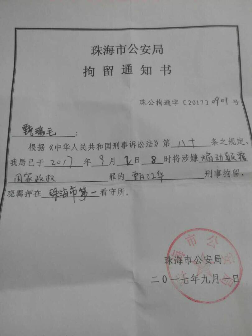 于数天前被从家中带走的广东维权人士甄江华,目前确定被以“煽动颠覆国家政权罪”之名刑拘,关押在珠海第一看守所。有律师9月6日前往看守所申请会见被拒绝,国保还打电话对律师进行骚扰。Dh3免费翻墙网